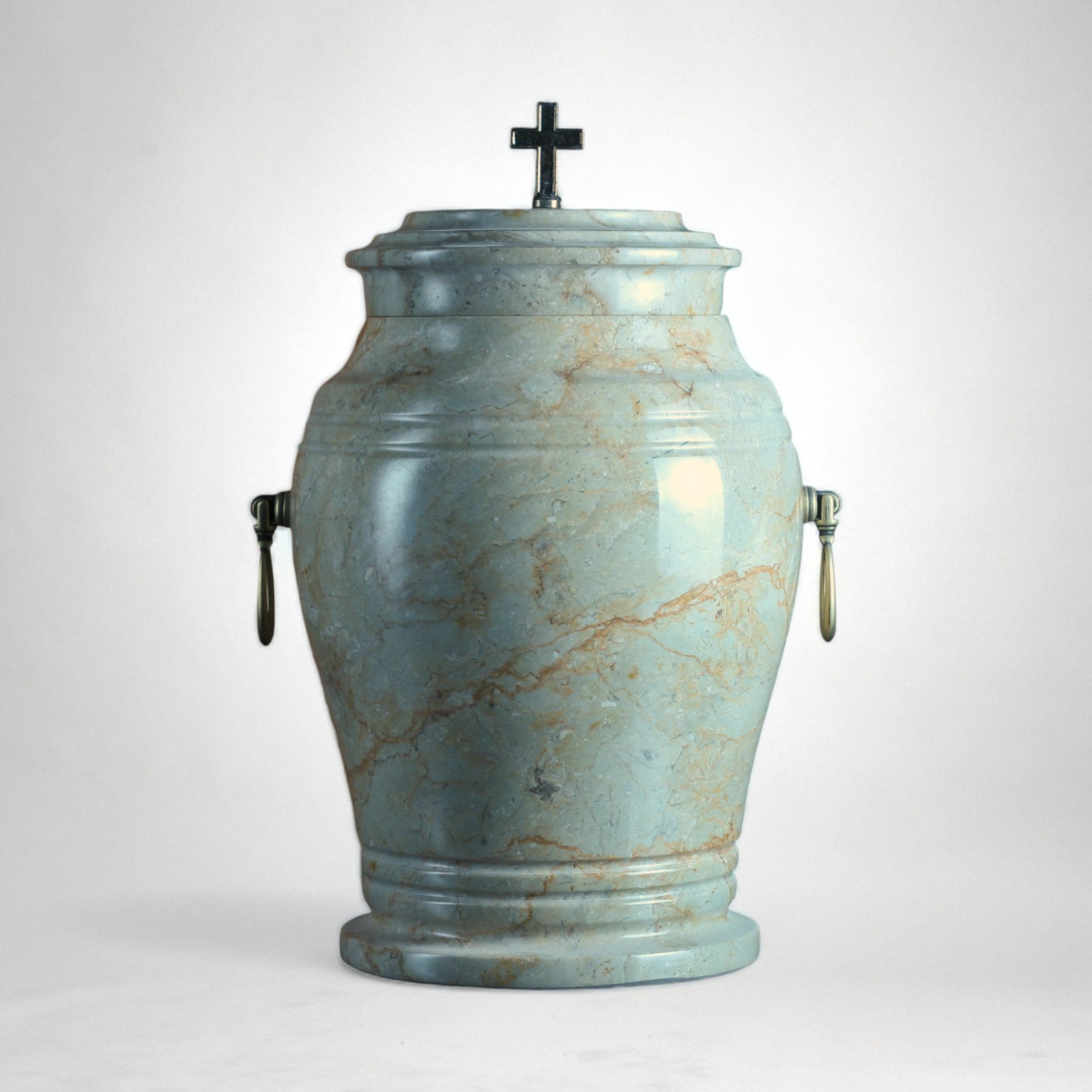 Urna kamienna wykonana z beżowego marmuru typu Crema Marfil, wykończona mosiężnymi uchwytami oraz krzyżem (opcjonalnie płomień) na pokrywie.