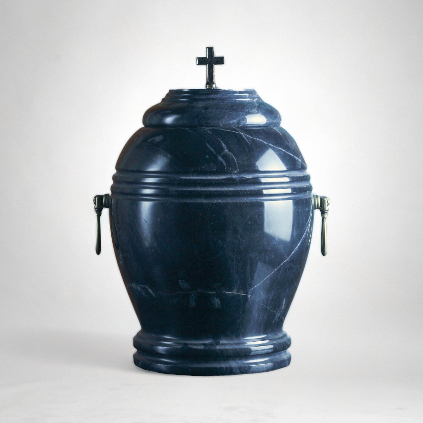 Urna kamienna wykonana z czarnego marmuru typu Calatorao, wykończona mosiężnymi uchwytami oraz krzyżem (opcjonalnie płomień) na pokrywie.