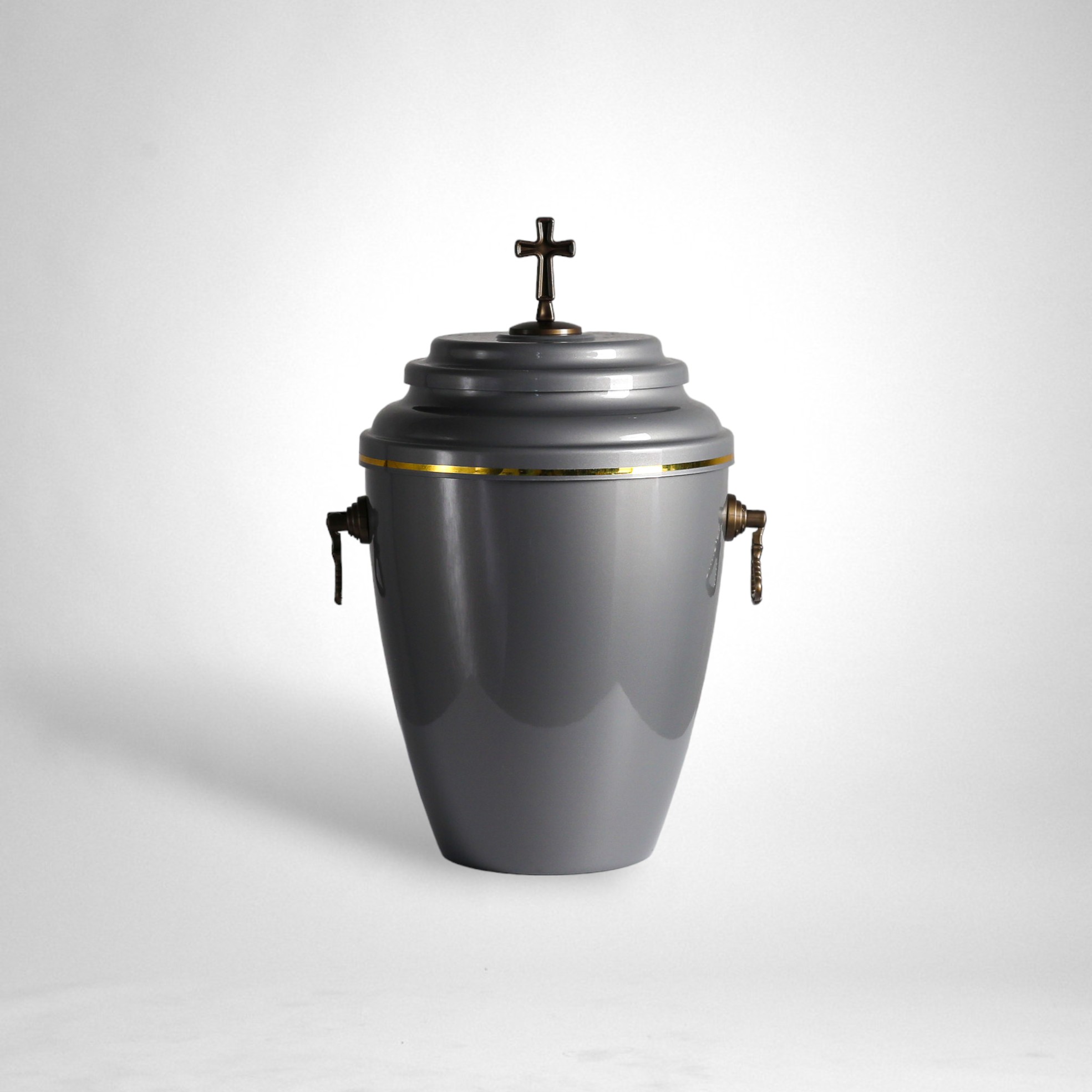 Urna z tworzywa sztucznego, polakierowana na wysoki połysk, wykończona uchwytami i krzyżem na pokrywie.