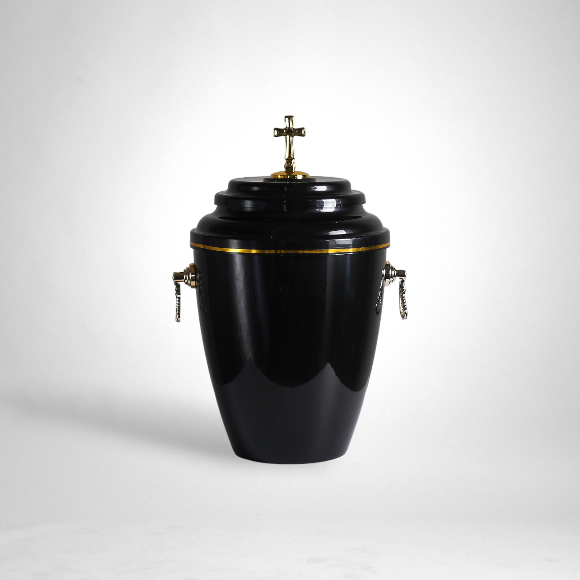 Urna z tworzywa sztucznego, polakierowana na wysoki połysk, wykończona uchwytami i krzyżem na pokrywie.