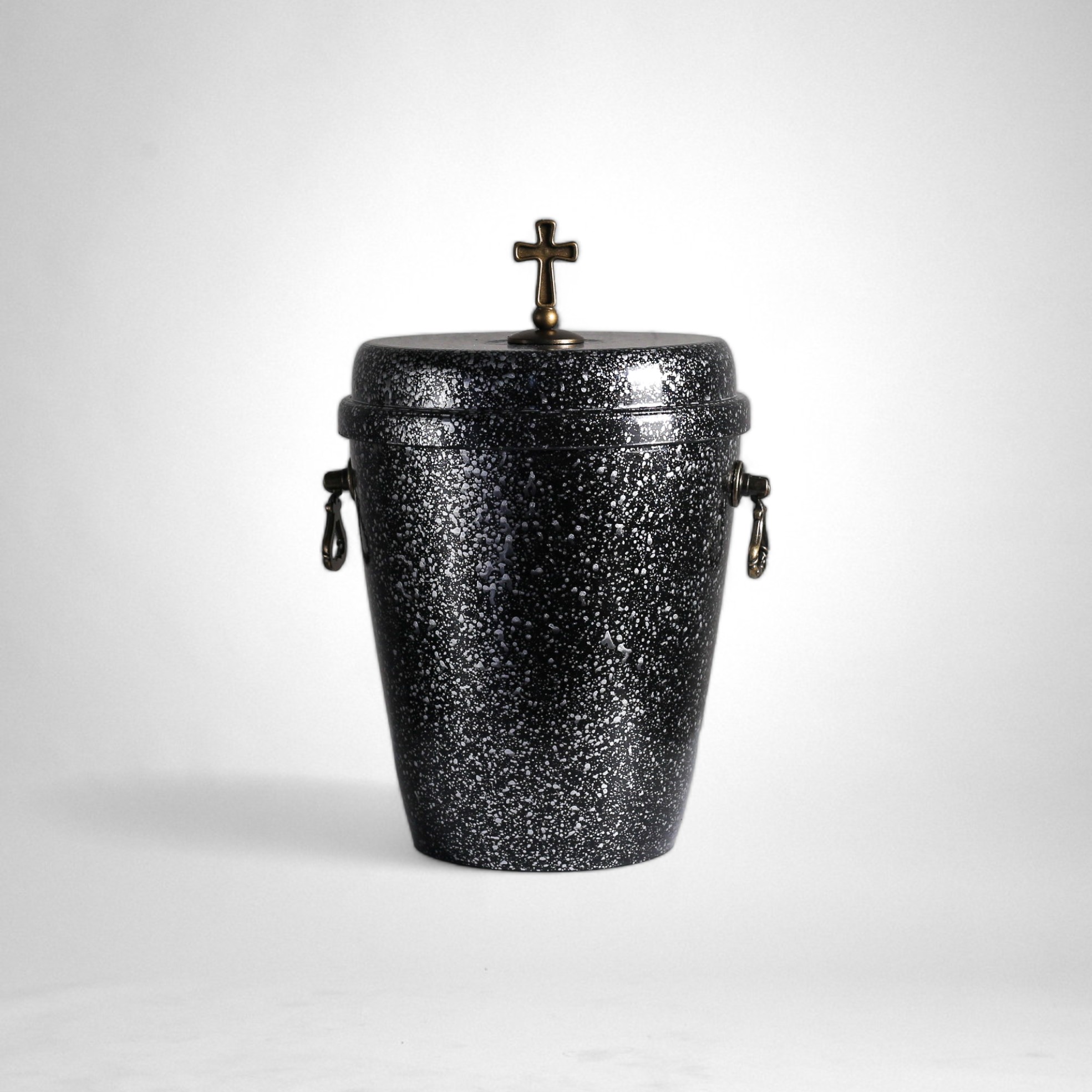 Urna z tworzywa sztucznego, polakierowana satynowo, wykończona uchwytami i krzyżem na pokrywie.